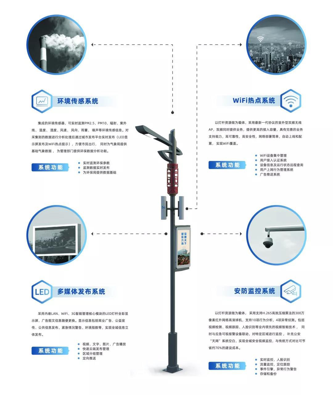 作為智慧城市建設(shè)的重要載體它還將氣象環(huán)境監(jiān)測、WIFI熱點(diǎn)系統(tǒng)、視頻監(jiān)控系統(tǒng)、信息發(fā)布系統(tǒng)、公共廣播系統(tǒng)、充電系統(tǒng)、求助報警等等應(yīng)用,渾然一體的融合在桿體上,使之發(fā)揮更大的綜合體作用,滿足城市基礎(chǔ)設(shè)施和關(guān)鍵公共服務(wù)的需求。